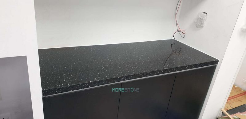 Ấn tượng mẫu thi công nội thất bếp mặt bếp bằng đá Himacs màu đen rất đẳng cấp.